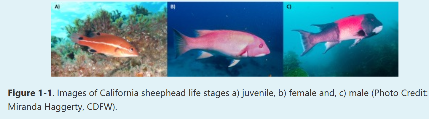 California sheephead, as like many wrasse, are born female and can morph into functional males throughout their lifespan, called Protogynous sex change. This change is moderated by a steroid hormone, and is undertaken by the largest and best fed individuals in an area. Male fish are distinct by their black heads and tails, as compared to the female sheephead which remain a dusky pink color. Sheephead are hermic spawners, and males have a group of females of which they protect and breed with. When the male for a group of females passes away, the largest female will morph into a male form and take the role. This can take anywhere between 2 weeks or several months. The mating season for these fish is between June and September, and the male will lead all his females in a circular pattern, releasing eggs and sperm. Females during this time can release as many as 130,000 to 375,000 eggs in a day, which will hatch into planktonic larvae. They will continue life as larvae for 34 to 78 days, before settling in a shallow reef and growing as normal. For their first year after settling these fish will appear different from both male and female sheephead, bright red-orange and a white stripe along the lateral line, with dark spots on the caudal fin. By the time they reach an age of 4 and a size of 10 inches, the fish are ready to spawn, although this is variable between populations. These fish can live upwards for 20 years in the wild, and as long as 50 in captivity, living through tens of breeding seasons, and producing hundreds of children.