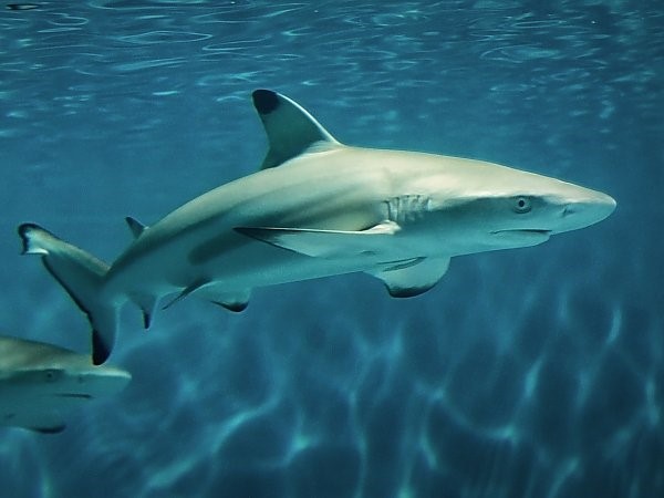 Similar to many others within the Carcharhinidae family visually, the black tip shark can be identified by the black tips along the pectoral, pelvic, doral, and caudal fins. One of the behaviours that gets these sharks mixed up with their relatives is spinning. Like the spinner shark, the blacktip shark is known to complete a corkscrew motion, launching itself out of the water as fast as 21ft/second. THe shark, once above water, will then rotate along the axis 3-4 times before landing. It is thought that this behavior is used to dislodge sharksuckers. Another behavior of blacktip sharks, is an agnostic display, which is a response to when threatened or challenged. The blacktip responds by swimming toward its competitor, rolling side to side and making sideways biting motions.