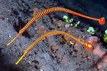 As like other pipefish, who are related to seahorses, these fish contain a specialized breeding pouch. Males will brood the eggs in this pouch, which is under the truck, filtering aerated water to them throughout their gestation. During this time the female of the pair will bring back food for both of them, though never straying far, as a female and a male will bond for life, refusing to mate again after their partner dies.