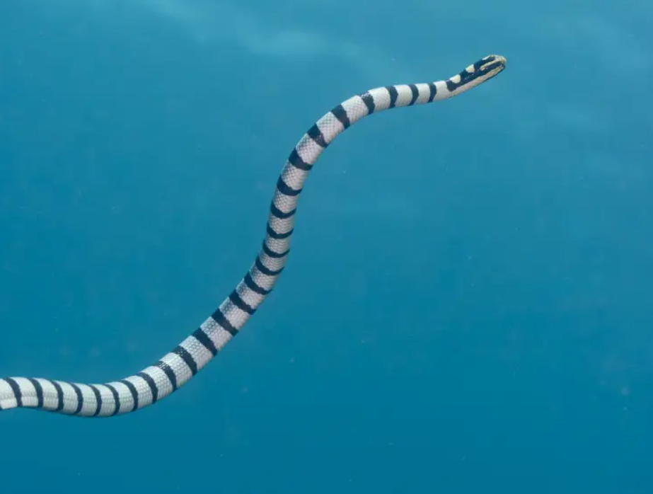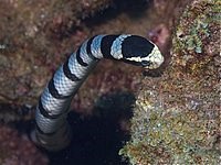 Hunting is done alone, despite large numbers gathering together before and after hunts, and they eat primarily moray eels. This is done by flushing out their prey from narrow crevices and holes, by probing their head in. They then used their striped tail to convince the eel that their tail is their head, tricking them into attempting to flee in the wrong direction, then once the eel is close enough, they strike. Another thing that the yellow barred sea krait is known for is their venom. This venom is a rather powerful neurotoxin protein from the alpha neurotoxin family, which disrupts the synapses, causing paralysis.