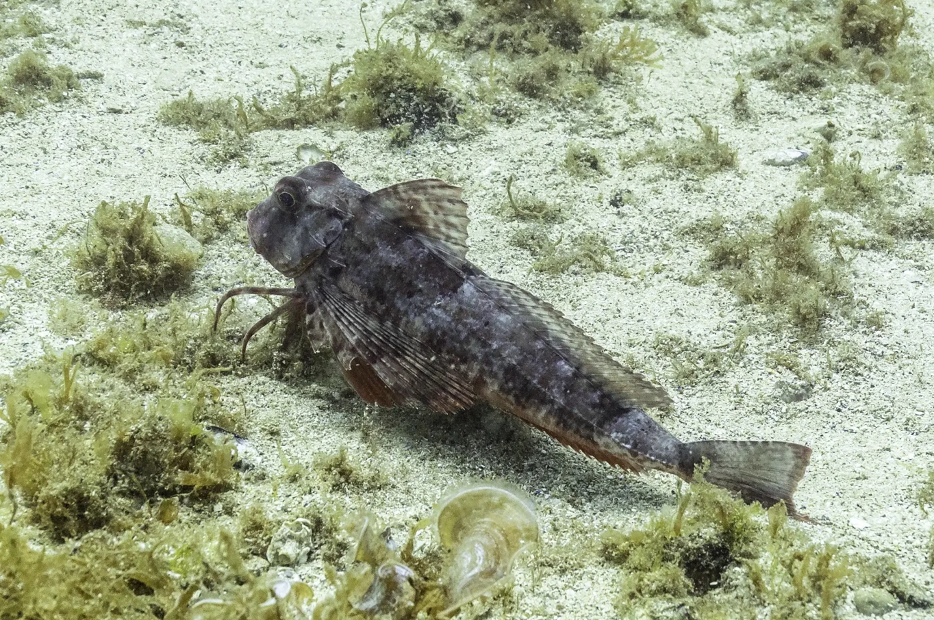 The spiny red gurnard is a migratory species, during the winter and autumn they head to deeper waters away from shore, and during the early spring, they came back inshore, where there's more food. The diet of the spiny red gurnard is similar to that of other other gurnard's and sea robins, consists primarily of worms, and small crustaceans, although on rare occasion they'll eat smaller fish or fry. The six leg like appendages for which they are so well known, are rather 6 additional and separated pectoral fins.