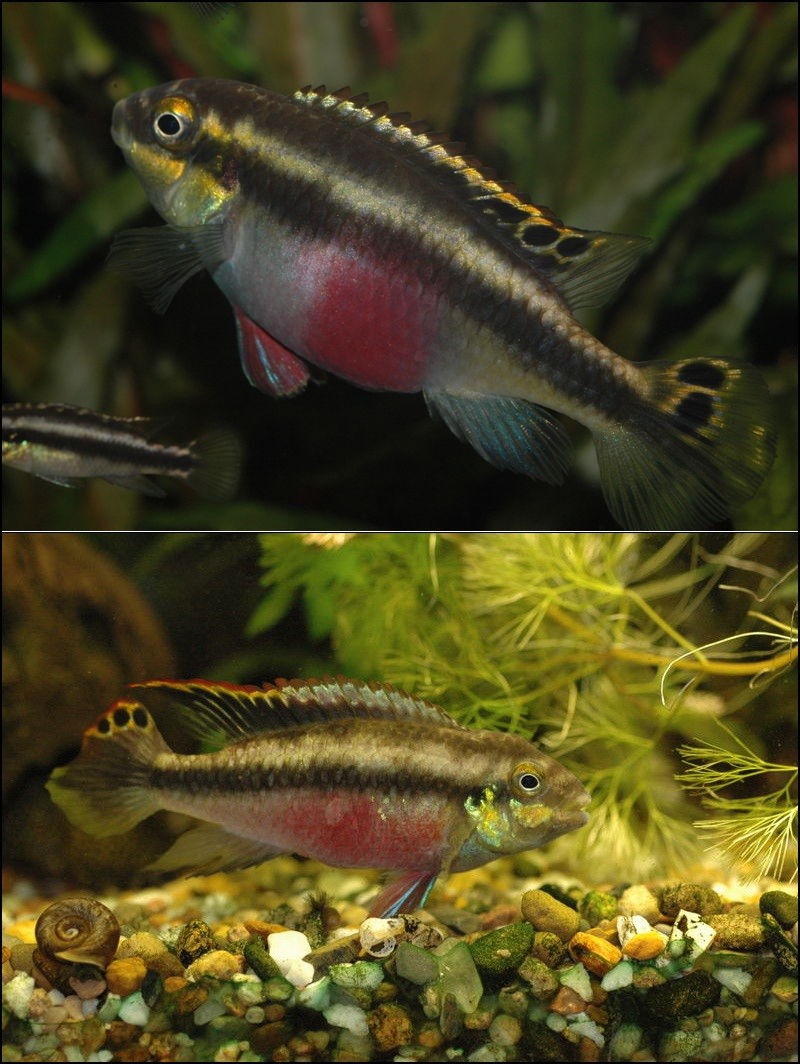Within the kribensis cichlid there is significant sexual dimorphism. Male fish are larger than female fish, alone with having a more rounded appearance, along with lacking the bright coloration. Breeding is done in holes that are produced under plants or in natural cave formations, so long as they are small and partially hidden. Eggs, when layed are adhesive, and form in rows along the upper surface of the cave, which are then brooded by the female for 20-30 days. After this, both male and female kribensis care for the fry, males acting as territorial guardians to drive away predators, and females feeding the young.