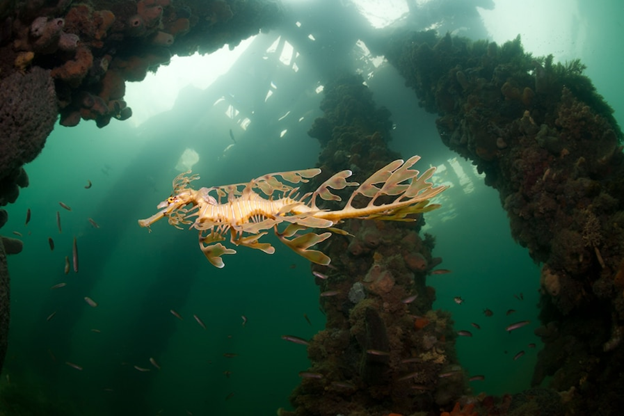 The leafy seadragon, also known as "Leafies", and Glauert's seadragon, scientific name Phycodurus eques, is known for their unique camouflage! Originally thought to exist in small and interspersed populations, it is now known that they are widespread, and can be found on the Southern and Western coast of Australia, these fish are native to kelp beds and other grassy areas, although they can also be found in sandy patches. They prefer areas at depths more than 50 meters below the surface, and this is where they reside close to the seafloor.