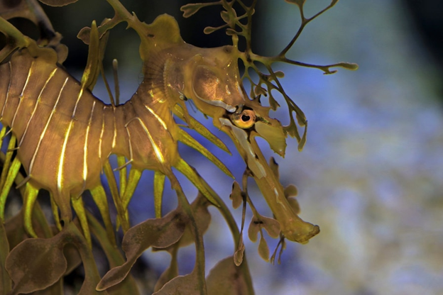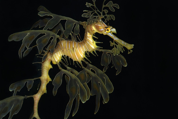 Like others in the Syngnathinae family (Pipefishes, seahorses, and seadragons), leafy seadragons have incredibly poor swimming skills. They swim via quick movements form the dorsal fin, and although pipefish have the aid of a caudal fin, seahorses and seadragons have no such luck. Seadragons also lack the prehensile tails that is associated to their seahorse cousins, leaving them only with camouflage to aid their survival. The leafy seadragon diet is made up of tiny planktonic crustaceans called mysid shrimp. These shrimp are caught by sucking them into the mouth of the fish, and they have advanced enough eyes to hunt them. They can get as large as 20 inches, but most only get about as large as 12inches on average.